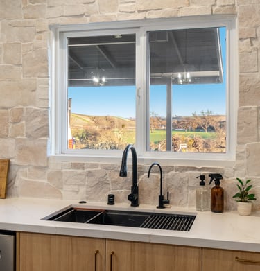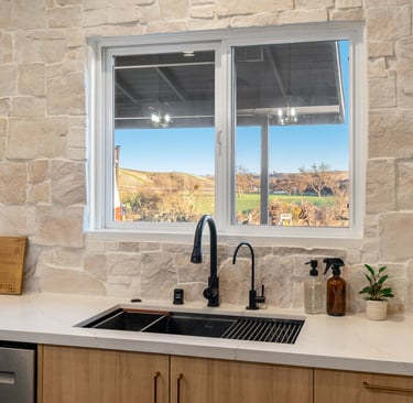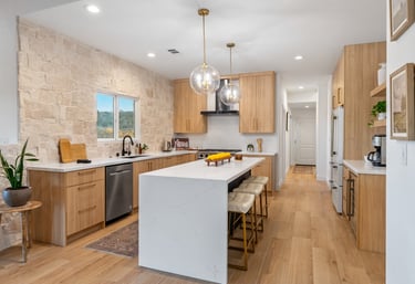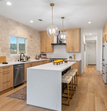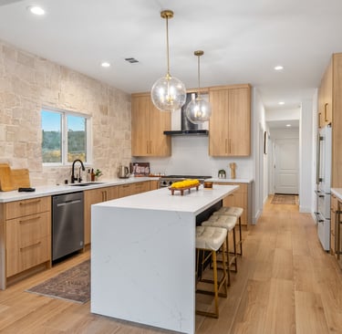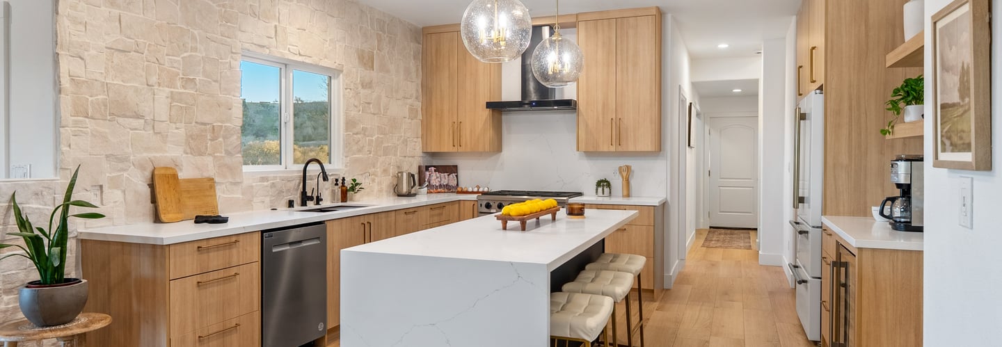 Using our Nukitch Haven Cabinetry, this investor leveraged a unique design combo, custom hood with cabinetry materials, and accent on 7ft island to tie in other elements of this home to meet buyer's expectations along with budget and space challenges.